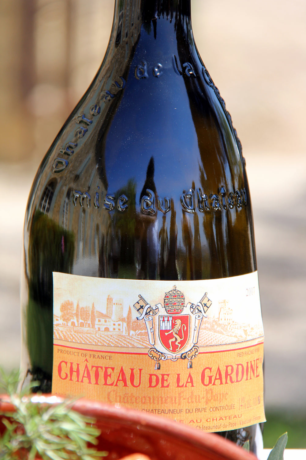 Een van de meest bijzondere kenmerken van het domein is de iconische Gardine-fles, met haar onregelmatige vorm die doet denken aan een antieke amfoor. Volgens de familie Brunel werd de vorm in de jaren vijftig ontdekt toen men tijdens graafwerken een oude, misvormde fles vond. Geïnspireerd door dit historische object besloot de familie hun wijnen een unieke identiteit te geven. Zo werd de Gardine-fles geboren—een symbool van authenticiteit en verbondenheid met het verleden.